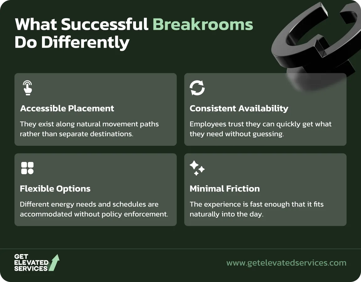 A breakroom is successful only when it fits behavior patterns, not just space availability.